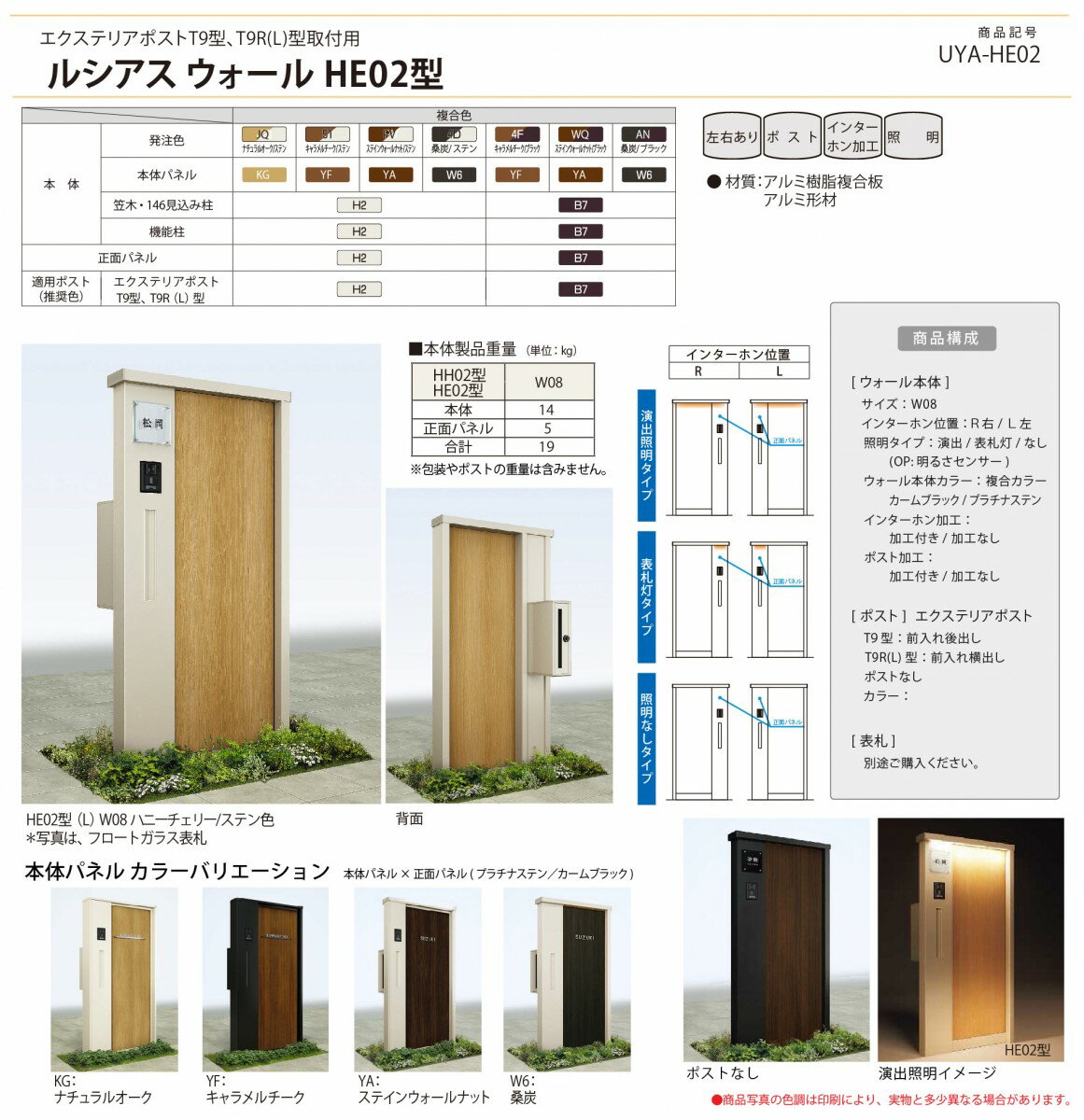 材質アルミ形材カラー笠木・146見込柱:ハニーチェリー、キャラメルチーク、ショコラウォールナット、桑炭 正面パネル:カームブラック、プラチナステンセット内容・ルシアスウォールHE02型 W08 演出照明タイプ本体・正面パネル ポスト加工なし インターホン加工なし注意事項送料無料:※北海道・沖縄・離島除く。