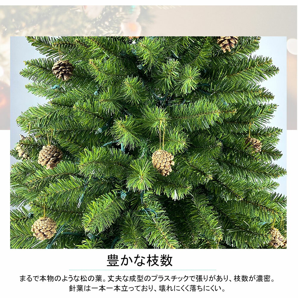 クリスマスツリー 180cm スチール脚 おしゃれ 北欧 送料無料 クリスマスツリーセット オーナメントセット LEDイルミネーションライト LEDロープライト 本体サイズ:約幅83×高さ180cm 松ぼっくり48個 LEDライト250球付き 材質:スチール、PVC おすすめポイント :【松ぼっくり48個&光る250つLEDライト付き】 カラフルで多彩なオーナメントが付いてくるクリスマスツリーです。