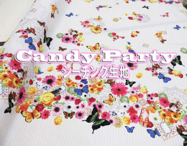 定番人気☆ 裾ボーダー Candy Party バタフライ キャット フラワー柄 シーチング生地 (入園入学 キッズワンピ スカート スモッグ バッグ エプロン カバーリング インテリア 手芸 ハンドメイド)