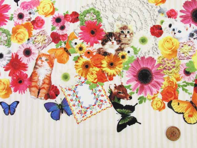 サイズ:110cm巾 ストライプ(白)巾=約5mm ストライプ(ベージュ)巾=約4mm 蝶々(大)=約幅80mm×縦68mm 1リピート=約605mm 110cm巾x10cmの価格です。